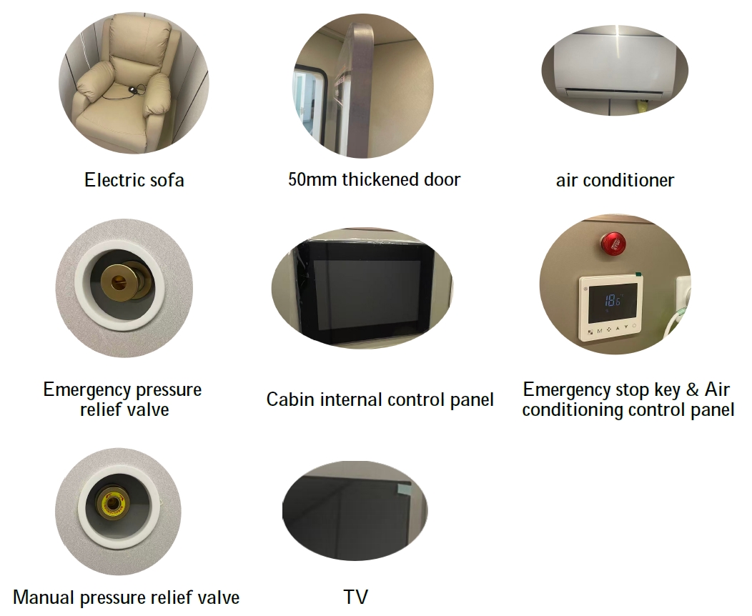 | Cabin Configuration | Includes water-cooled air conditioner, 4 set of electric sofa, 4 set of oxygen terminal, upholstery, carpet, lighting, wireless intercom, 50-inch DC Smart TV, oxygen source, and internal and external duplex control panels. | |